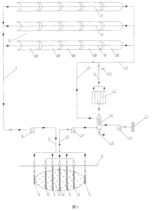 太阳能集热系统和气体加注系统,空气过滤器 (17) →鼓风机 (12) →气液分离器(16) →输气管道 (19) →集热管 (9) →输气管道 (7) →空气压缩机 (6) →气体加注管道(5) →加热扩散井 (1) ;